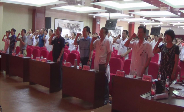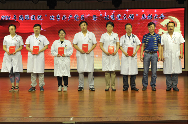 2016年6月29日,海港医院“迎七一优秀共产党员暨优秀党支部” 表彰大会隆重举行,出席本次会议的有卫计工委委员、计生协会秘书长鲁龙、执行院长王晓光、党总支书记尤江立、党总支副书记刘颖、副院长肖长春、副院长尹清志、副院长李清友、副院长李宏刚、副院长周福霞,医院全体党员参加了本次表彰大会。活动由全体党员重温入党誓词拉开序幕,党总支书记尤江立带领大家,面对鲜红的党旗,高举右手庄严宣誓,重温了自己最初那份对党忠诚、誓为党的事业奋斗终身的坚定信念。