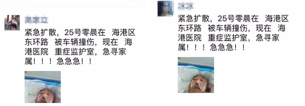 我院的医护人员在得知找不到老人家属后,第一时间将寻人信息发布到院里的微信群内,群内成员积极将信息扩散到自己的朋友圈,希望能尽快联系到老人的家人。