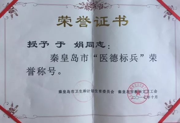 近年来,我市大力弘扬爱岗敬业、恪尽职守、尊重生命、乐于奉献、文明行医、全心全意为人民服务的道德风尚,经市医德标兵评选小组评审,市卫生和计划生育委员会、市科教科文工会决定,授予我院老年病科于娟主任“医德标兵”荣誉称号,于娟主任用自己的实际行动感动患者、呵护患者,为海医人争光!