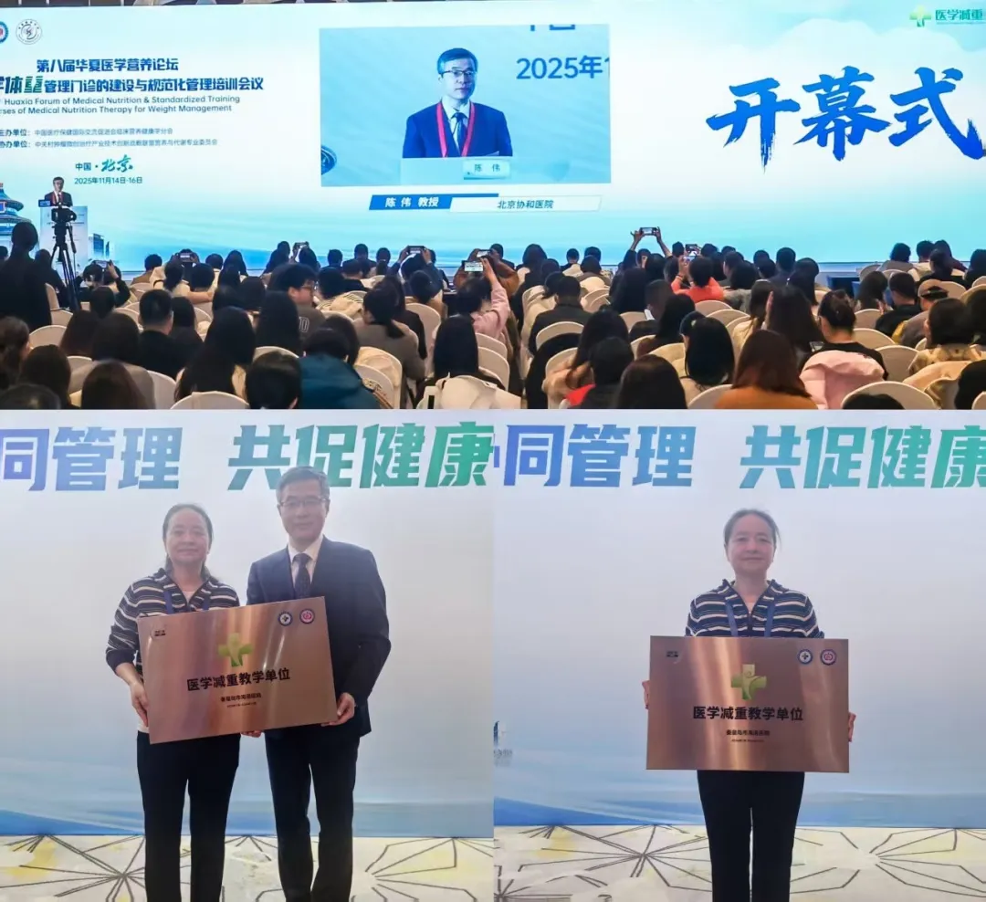 近日,中国医疗保健国际交流促进会、临床营养健康学分会,“第八届华夏医学营养论坛暨医学体重管理门诊的建设与规范化管理培训会议“在北京隆重召开。会上,海港医院凭借在营养诊疗、体重管理领域的扎实积淀与专业实力,从众多申报单位中脱颖而出,成功获评“医学减重教学单位”!我院临床营养科(体重管理门诊)马长红代表医院接受授牌,这一荣誉标志着我院在营养与体重管理领域的专业水平获行业权威认可,诊疗规范化建设迈上新台阶。