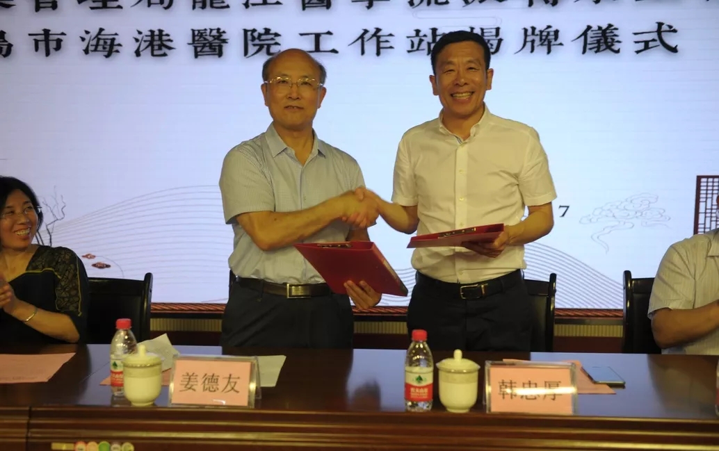 黑龙江中医药大学附属第一医院院长姜德友、秦皇岛市海港医疗集团院长韩忠厚共同签署“国家中医药管理局龙江医学流派传承工作室秦皇岛市海港医院工作站建设任务协议”。