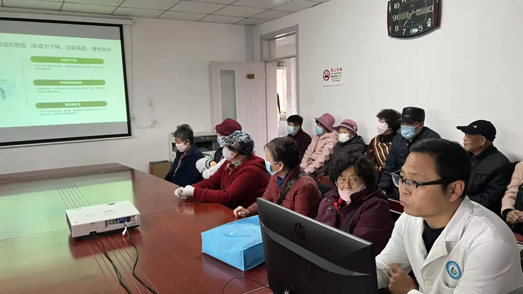 活动伊始,呼吸科李海刚医生以《冬季老年人呼吸道疾病预防》为主题展开讲解。他结合冬季气候特点,从“为何老年人冬季易患呼吸道疾病”切入,详细分析了低温、干燥环境对呼吸系统的影响,以及慢病患者因免疫力下降、基础病影响导致的患病风险增高问题。在预防措施环节,李医生重点强调:一级预防需注重日常防护,如规律作息、均衡饮食、适当锻炼,做好保暖和个人卫生,减少疾病发生;二级预防要强化早期筛查,建议老年人尤其是慢病患者定期进行肺功能检查,做到早发现、早干预;三级预防则需规范慢病管理,呼吸道疾病发作时及时就医,避免病情进展影响基础慢病控制。讲解过程中,李医生结合临床案例,用通俗易懂的语言解答了现场居民的疑问,实用性极强的内容让大家受益匪浅。