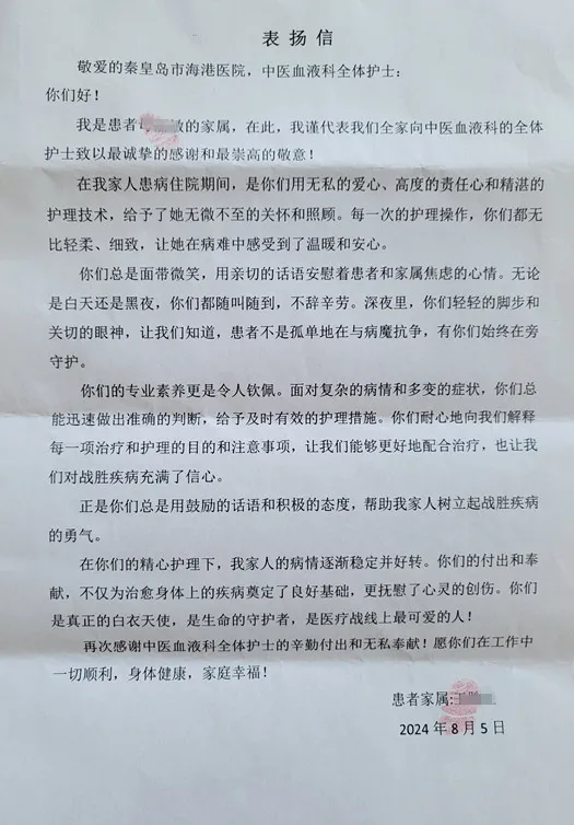 王大爷(化名)的妻子在2016年被确诊严重血液病,一直在天津治疗,外地就医报销生活压力巨大,且治疗效果也不理想,后期返秦辗转多家医院继续治疗,但病情依旧反复不见好转,承受着无处求医的煎熬。2023年7月,经朋友介绍后,来到海港医院中西医结合血液科就诊,通过与主任助理余丹的沟通交流,被她的专业和细致所折服,王大爷当即决定在我院进行治疗。住院初期病情严重,余丹不分白天黑夜时刻关注患者病情变化,针对病情变化制定精准诊疗方案,细致详实讲解治疗步骤以及会出现的问题,让他们在恐惧与迷茫中看到希望和方向。经过余丹的细心治疗,患者情况逐渐稳定。余丹如同亲人一般的贴心对待,时刻温暖着老两口不安的内心。更让他们感动的是余丹的正直与廉洁,为了对余丹表示感谢,他们送给她的购物卡,余大夫却以现金的形式充回到患者住院费中,他们对余大夫高尚的医德表示钦佩。在余丹大夫以及医护人员不遗余力的努力下,患者恢复良好,目前异常指标清零。