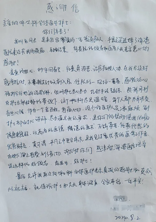 海港医院医护人员的职业自豪感和幸福感是患者给的,我们也定将不负信任,用精益求精的医疗服务为港城百姓的健康保驾护航。